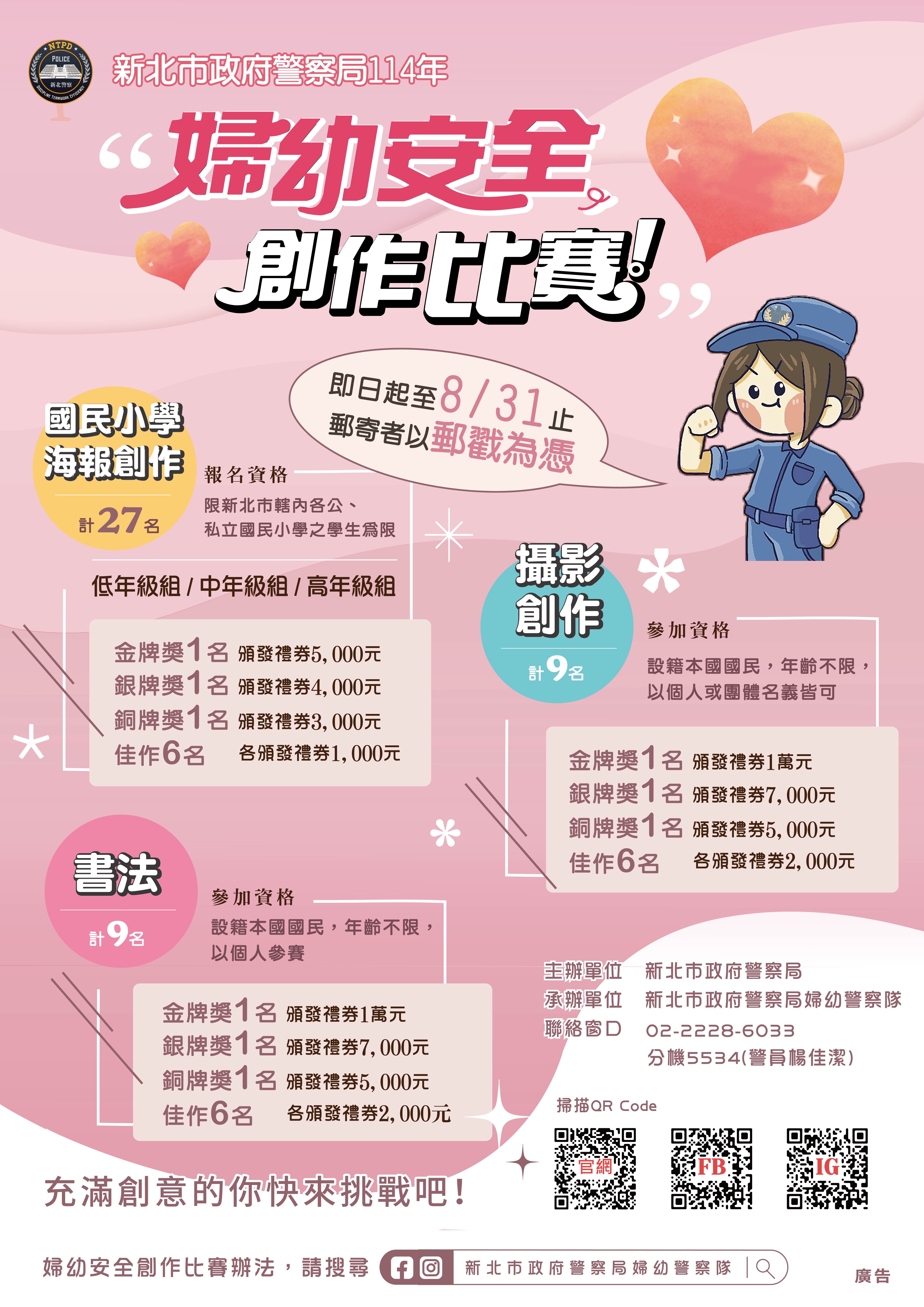 新北市政府警察局114年婦幼安全「國小海報創作」、「攝影創作」及「書法創作」比賽開跑囉!